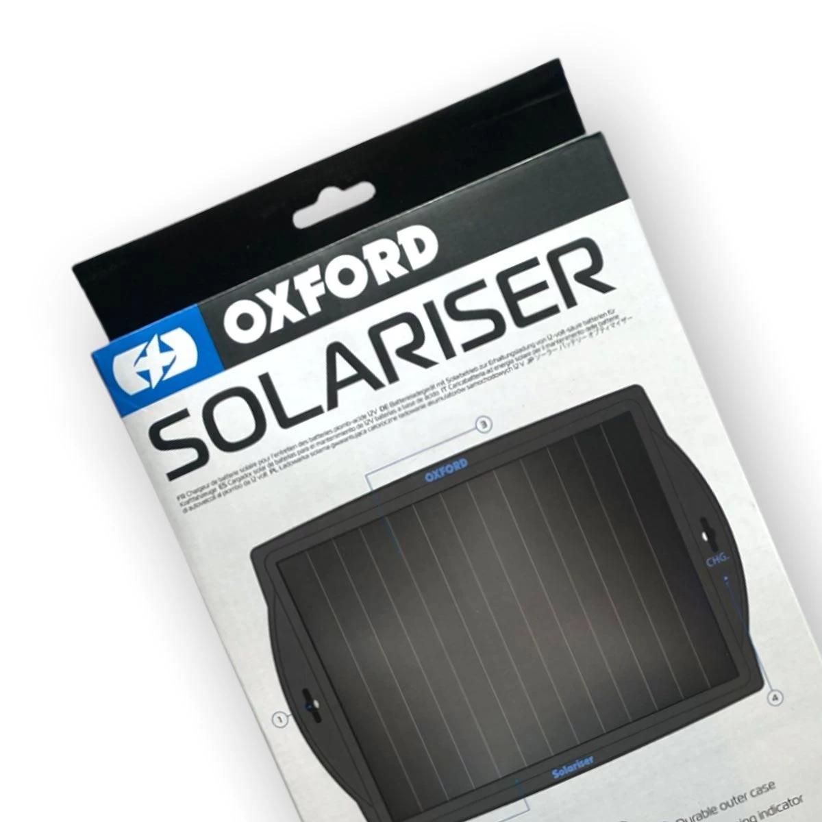 A 12V outlet plug to charge vehicle batteries (only works if the 12V outlet remains live while the ignition is turned off) Oxford WeatherProof Solar Charger